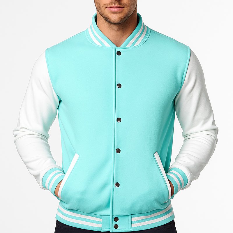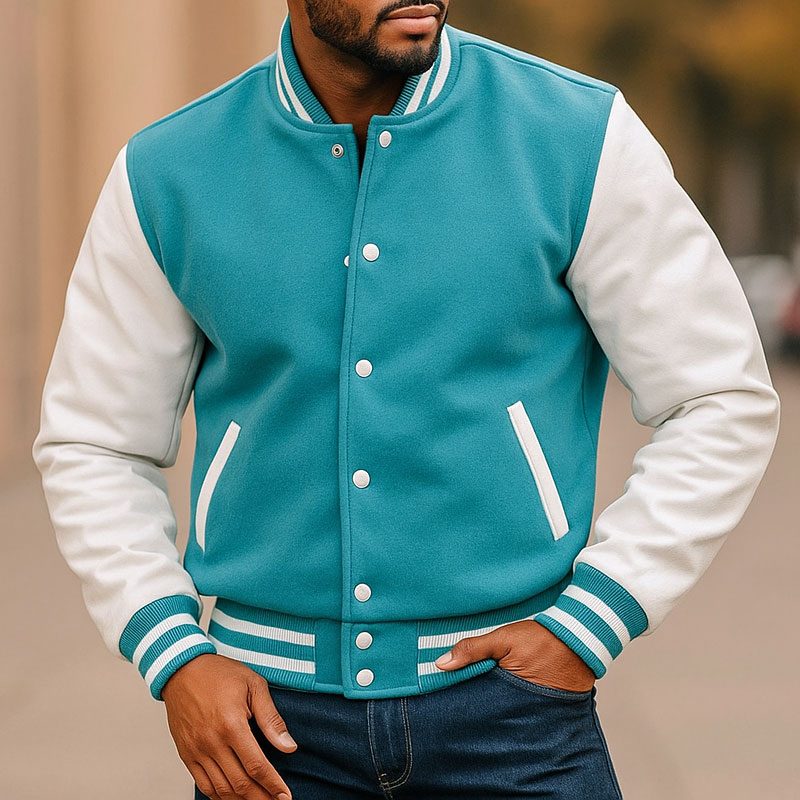 Men’s Varsity Jacket Light Blue & White Classic Baseball Letterman Bomber, Cotton Blend College Style Outerwear