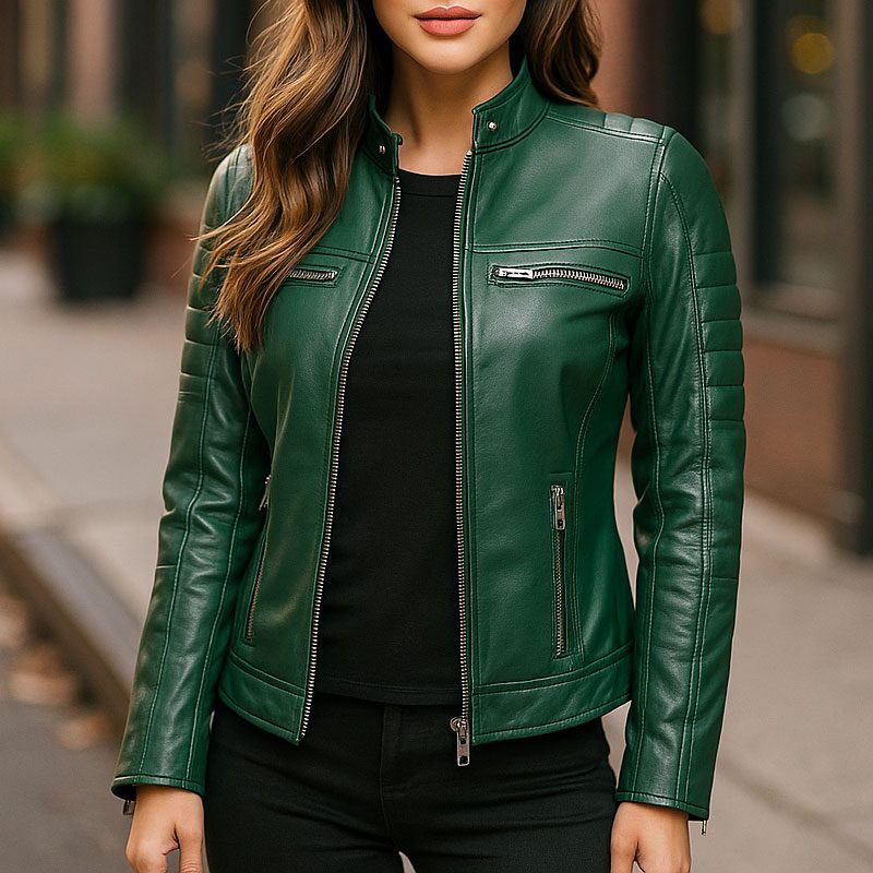 Women Green Faux Leather Jacket Stylish PU Motorcycle Biker Jacket, Cafe Racer Slim Fit with Quilted Shoulders & Zipper Pockets