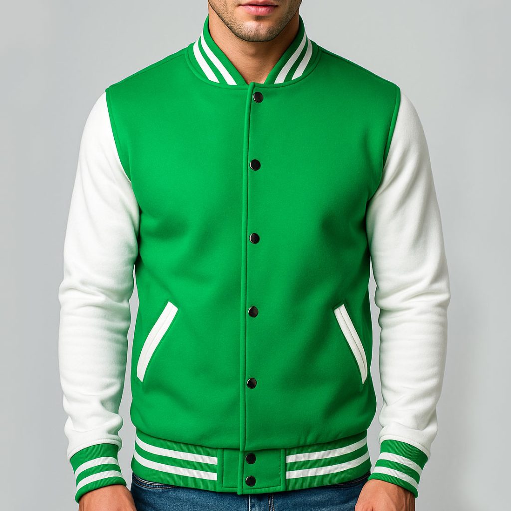 Men’s Varsity Jacket Green White Baseball Letterman Bomber College Style Cotton Blend Coat