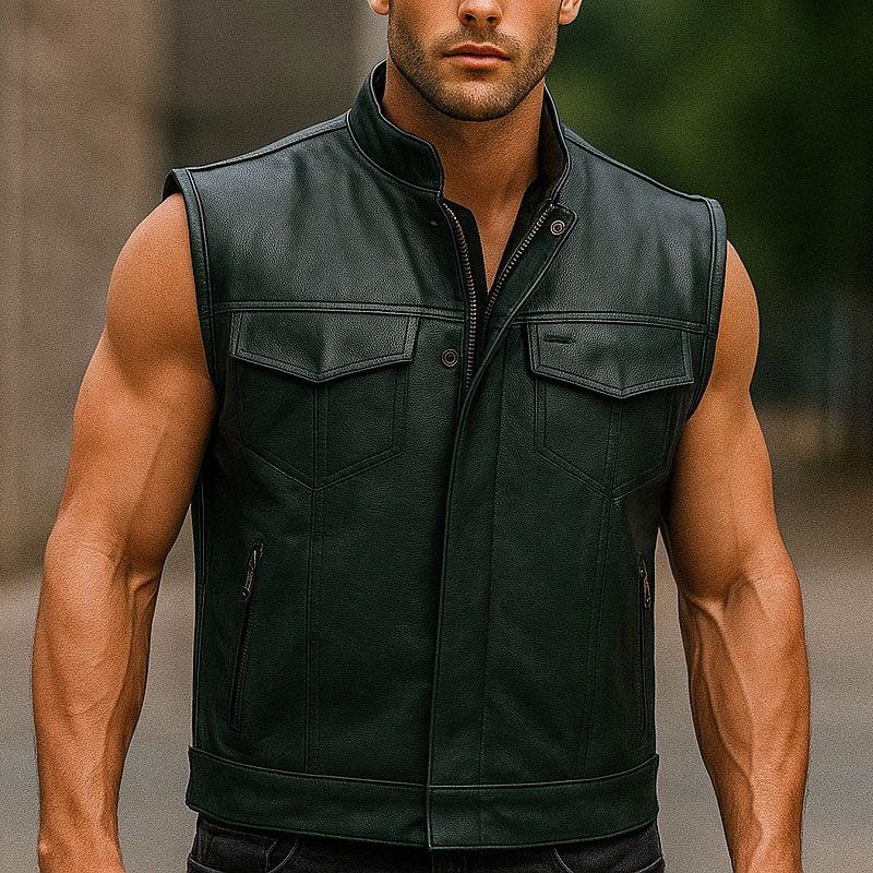 LuxHide Men’s Black Leather Motorcycle Biker Vest Club Style Riding Vest with Concealed Carry Pockets & Premium Cowhide Leather