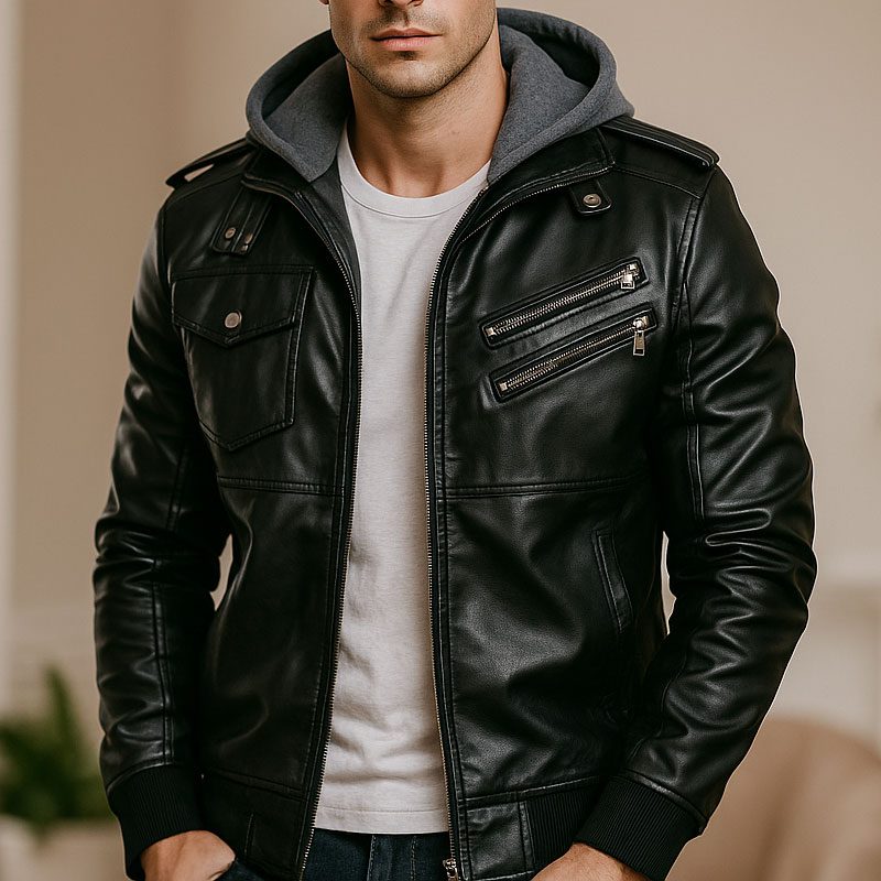 Men’s Black Leather Jacket with Removable Hood Zip-Up Biker Style, Casual Streetwear Outerwear with Multiple Pockets & Soft Lining