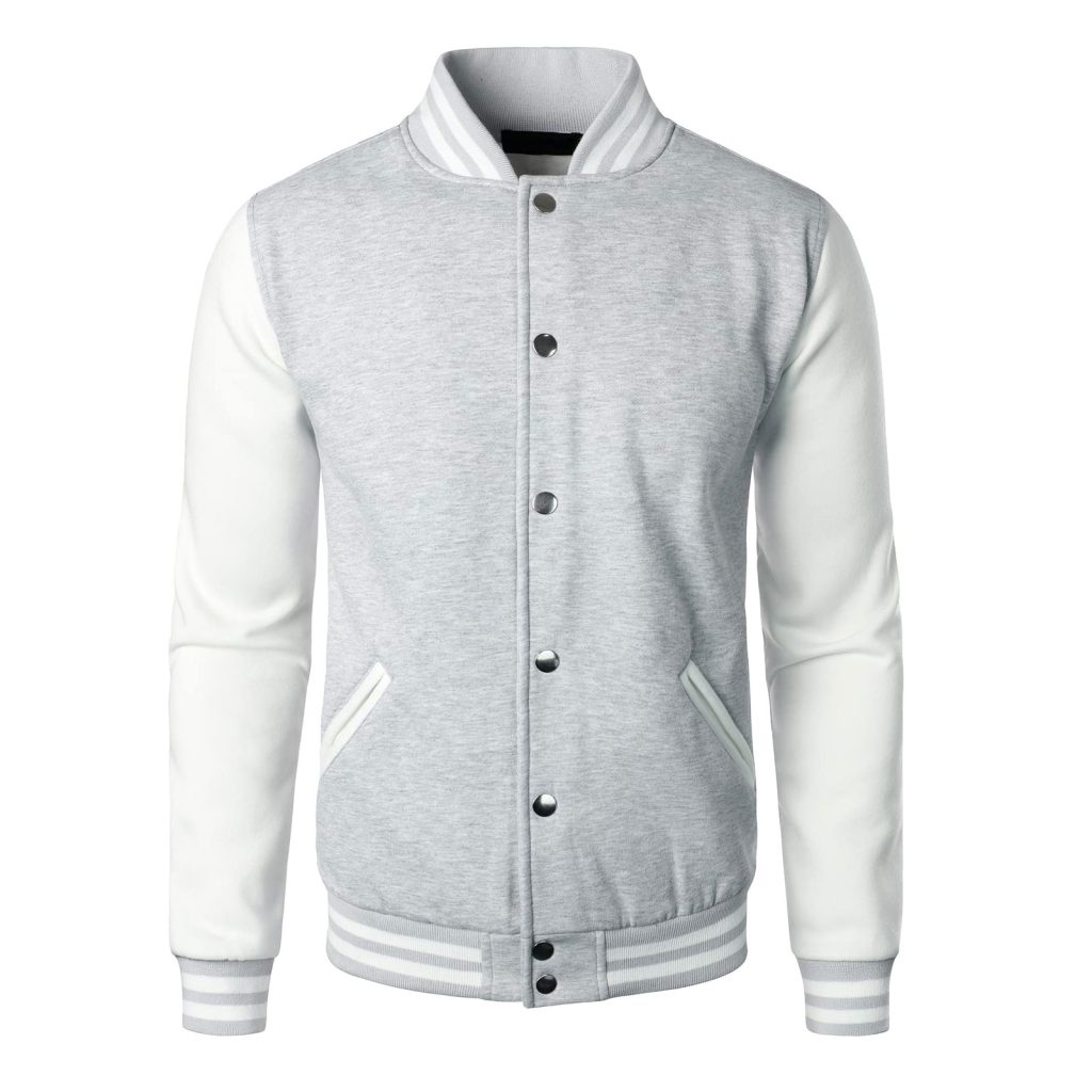 Men’s Varsity Jacket Light Gray & White – Classic Baseball Letterman Bomber, Cotton Blend College Streetwear Coat