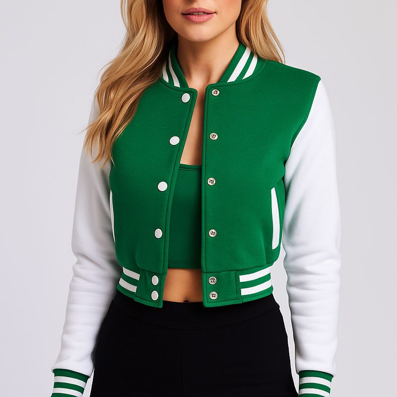 Green & White Cropped Varsity Jacket Women Trendy Baseball Letterman Bomber with Fleece & Polyester Comfort