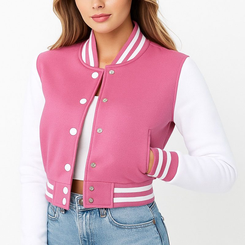 Pink & White Cropped Varsity Jacket Women Trendy Baseball Bomber Letterman Jacket with Fleece, Lightweight & Stylish