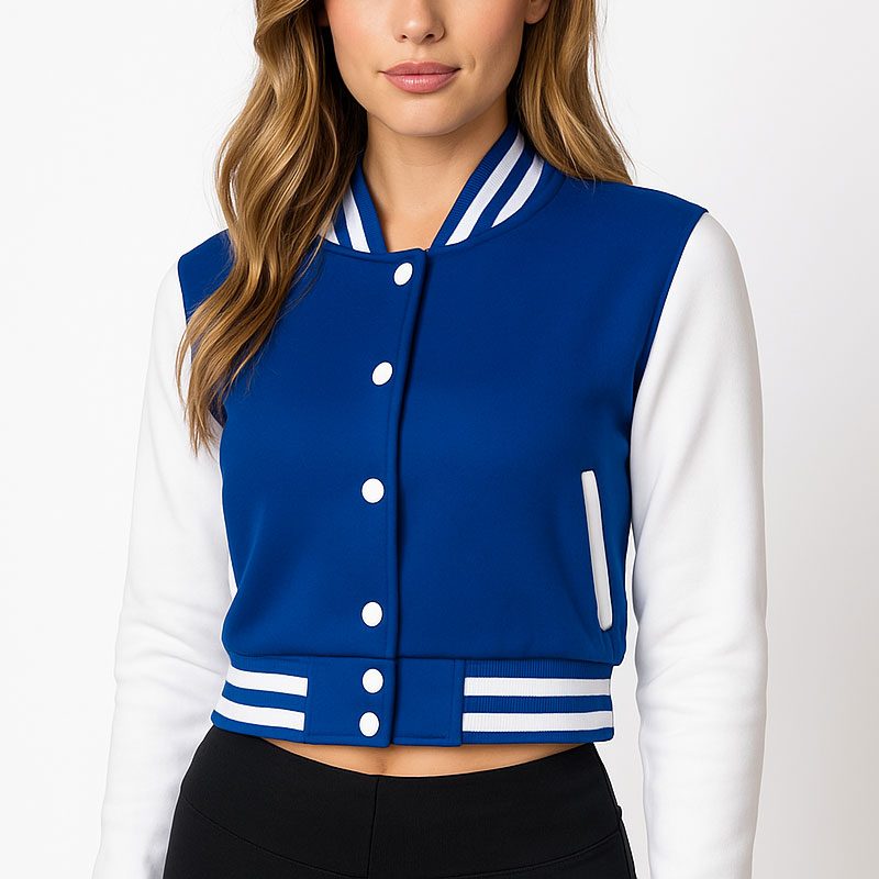 Blue & White Cropped Varsity Jacket Women Trendy Baseball Letterman Bomber Style with Fleece & Polyester Lining