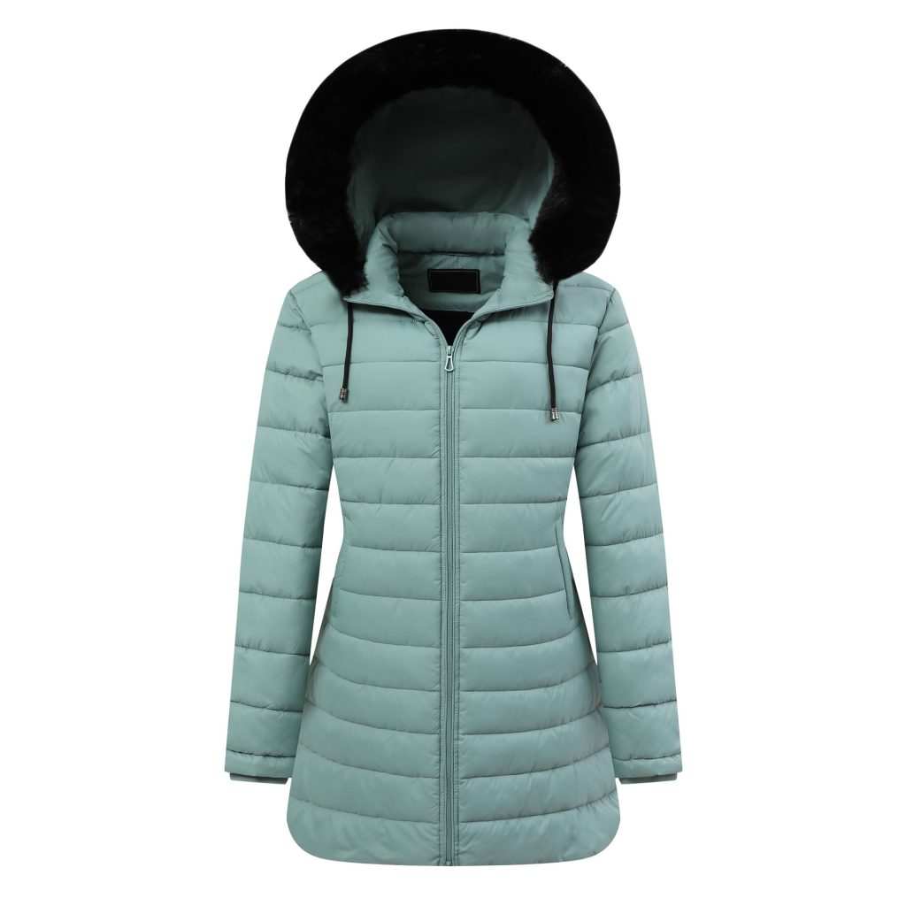 Light Green Women’s Waterproof Long Down Jacket Hooded Winter Puffer Coat with Fur Collar, Lightweight Insulated Parka for Outdoor, Hiking & Daily Wear