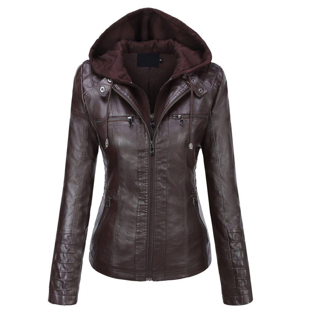 Women’s Dark Coffee Faux PU Leather Jacket with Removable Hood Slim Fit Moto Biker Style