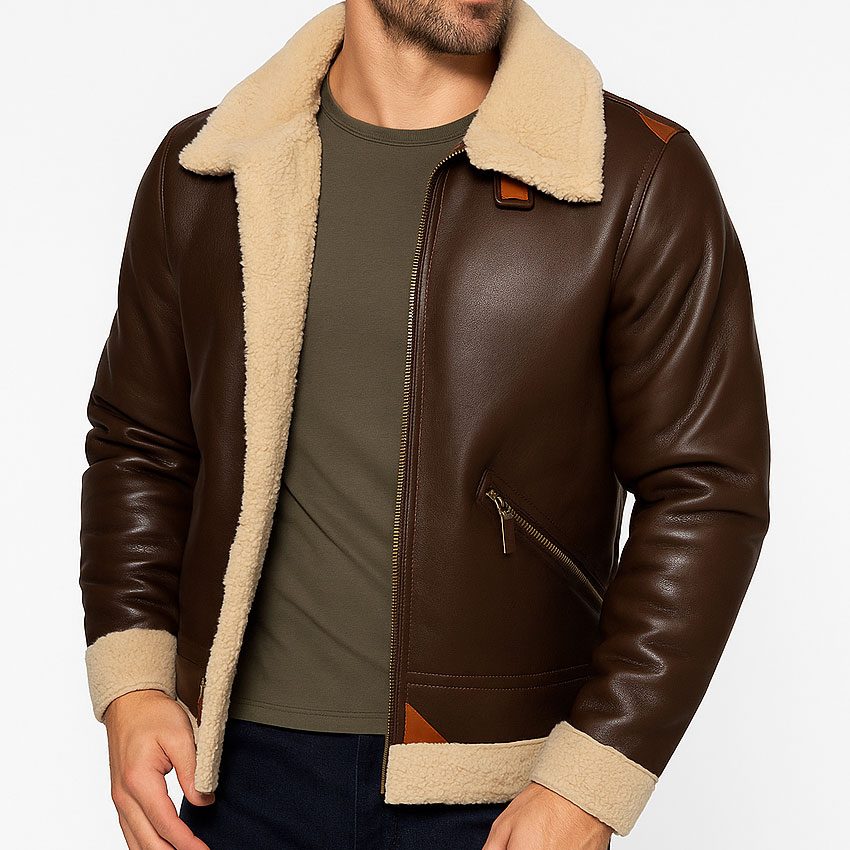 Men’s Brown Aviator Leather Jacket with Shearling Collar Classic Bomber Flight Coat Vintage Pilot Style Winter Outerwear