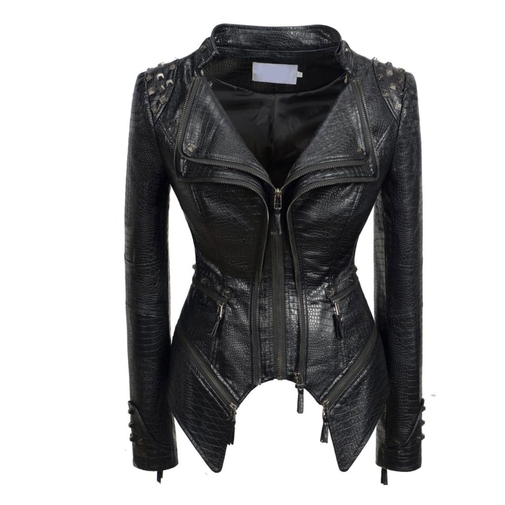 Women’s Black Punk Studded Faux Alligator PU Leather Jacket Moto Biker Zipper Coat with Rivet Lapel & Slim Fit Outwear