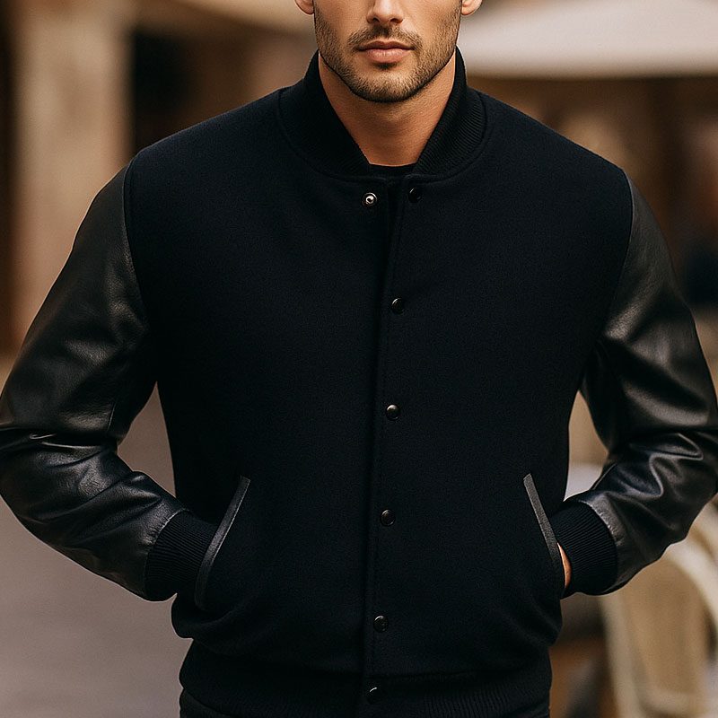 Men’s Black Varsity Jacket Wool Body with Faux Leather Sleeves | All Black Letterman College Jacket | Stylish Winter Streetwear Outerwear with Multiple Pockets